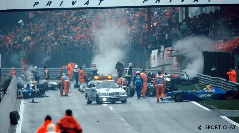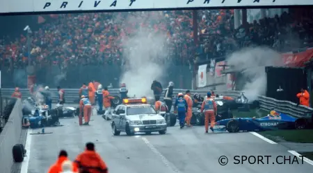 Гран-при Бельгии 1998 года навсегда вошёл в историю как одна из самых хаотичных и опасных гонок современности. С самого старта трассу накрыл проливной дождь, и вскоре после прохождения поворота Ла-Сурс участники направились в связку О-Руж. Именно там Дэвид Култхард на своём McLaren потерял контроль, ударился о внутреннюю стену и отскочил обратно на трассу — прямиком в гущу стартового пелотона.