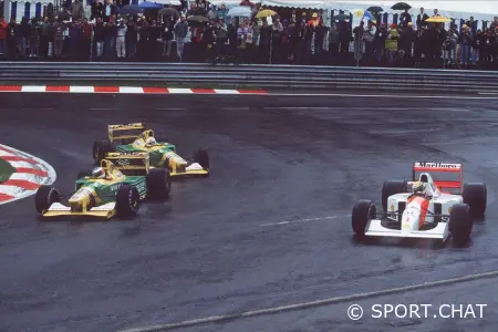 Михаэль Шумахер и Мартин Брандл на болидах Benetton B192 с двигателями Ford обгоняют Айртона Сенну, выступающего на McLaren MP4-7A с мотором Honda.