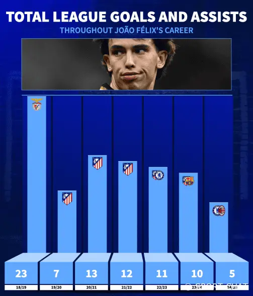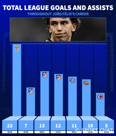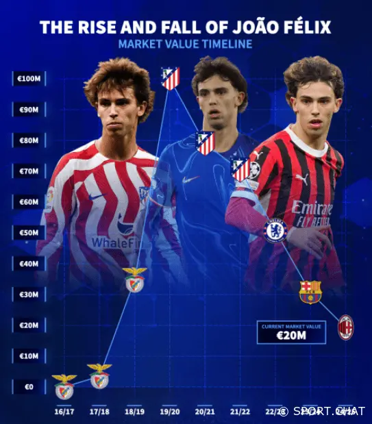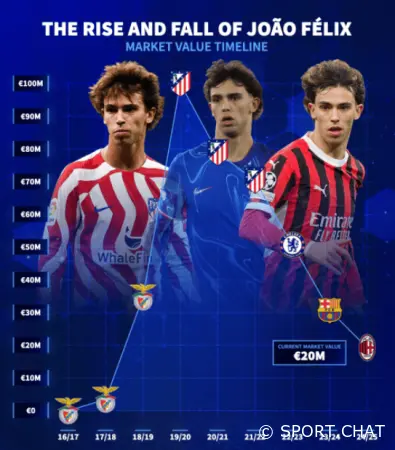 Несмотря на громкий переход в «Барселону», который должен был стать для португальской звезды новым стартом, его рыночная стоимость продолжала снижаться. К лету 2024 года, когда «Атлетико» планировал заработать на Феликсе, его цена упала до 30 миллионов евро. Хотя сумма, за которую «Челси» приобрёл игрока, была вдвое меньше трансфера пяти лет назад, это всё равно стало тяжёлым грузом для нападающего, который с тех пор изо всех сил пытается оправдать даже относительно скромные 52 миллиона евро.