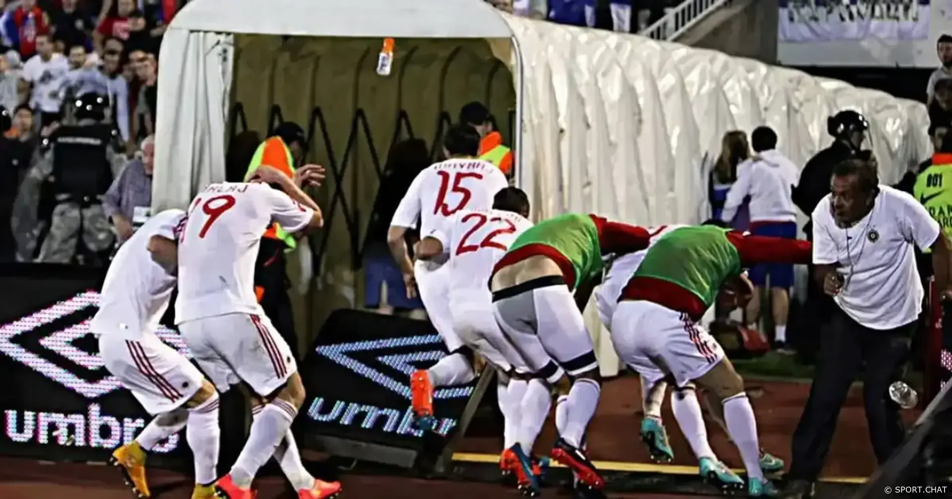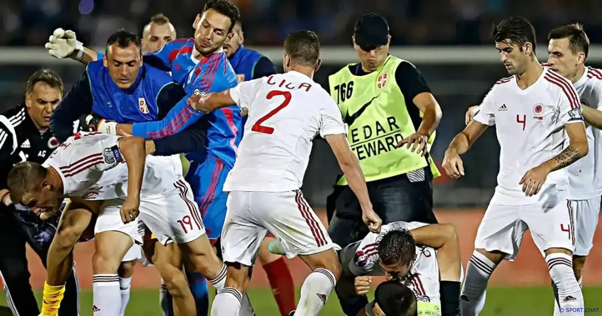 Защитник Сербии Стефан Митрович сорвал баннер, что взбесило албанских игроков Анди Лилу и Тауланта Джака, брата Гранита Джаки. Они бросились к Митровичу, пытаясь схватить флаг, и столкновение быстро переросло в массовую драку с участием других игроков. В итоге Беким Баладж попытался забрать баннер с поля, но на поле ворвался сербский фанат и ударил его пластиковым стулом по голове. Капитан Албании Лорик Кана вступился за товарища — и начался хаос.