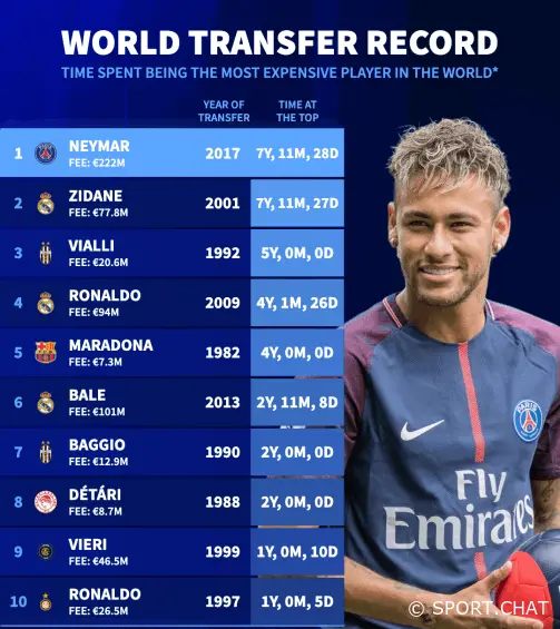 Неймар остаётся самым дорогим футболистом мира уже семь лет, 11 месяцев и 28 дней — на сутки превзойдя рекорд Зинедина Зидана, чьё первенство длилось семь лет, 11 месяцев и 27 дней после его громкого перехода из «Ювентуса» в «Реал» в 2001 году.